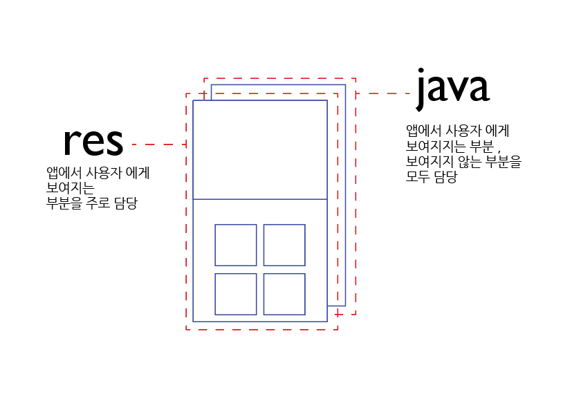 안드로이드는 크게 java 와 res(resource) 로 크게 나뉩니다. 아래의 설명과 같이 각각 주요 담당하는 역활이 있습니다.